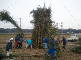 平成24年2月5日(日)、どんど焼きの準備をしました。朝から竹を切りだし、組み立てました。中にお正月の門松を入れ、しのぶ竹で囲みます。4時間ほどかけて完成しました。