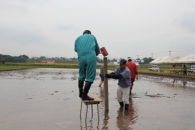排水路に設けていたシャワー用に水を堰き止めていた土嚢やブルーシートの撤去。そして、最後に会場となった田んぼの整地作業です。参加選手約700人、延べ1500人が戦った田んぼの中は、選手の服に付いて出た土でコートの中はほとんど土がなくなっています。