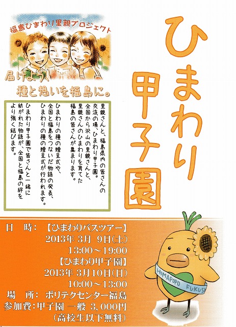 3月10日(日)、全国でひまわりを育てる里親さんと福島県内でひまわりを育てる皆さんとの絆づくりをはかるイベントとして「第1回ひまわり甲子園」が福島市内で開催されました。竹馬会も九州代表として参加し、里親としての活動報告を行いました。