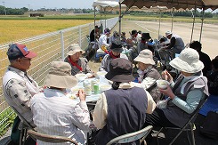 | 6月22日(日)、梅雨の雨の合間をみて河川敷の草刈りを行いました。前日からの雨も午前中で上がり、アメダスを見ながら午後から上がるという予報で決行しました。実施を決めて会員にメールを配信、11名が集合し1時間半で作業は終わりました。 |