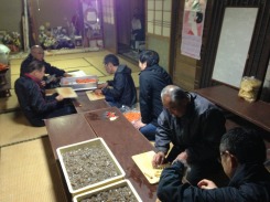 男性はコンニャクを千切りやニンジンの皮むき、女性はキャベツ、白菜、ネギ切りなど。今回は男女21名で1時間30分終わりました。