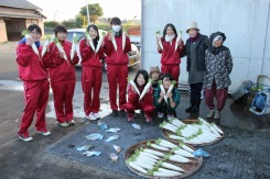 | 12月13日(土)、中津東高マーケティング部の野菜収穫第2弾、大根を収穫しました。種まきから2カ月余り、ごま粒程の小さな種からこんなに立派な大根が出来ました。冷たい水で1本1本丁寧に洗いました。販売は顧問の先生が奮闘します。 |