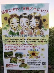 | 8月5日(木)、ひまわりが咲き始め、週末の見物のお客さん用に「福島ひまわり里親プロジェクト」の説明を書いた看板を夕方に設置しました。 |