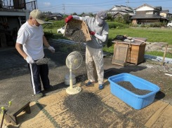 9月23日(木)、12日に収穫したひまわりの種も天日干しで乾燥ができたので選別作業を行い、米袋に2袋になりました。