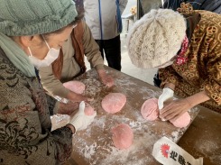 | 2月10日(土)、どんど焼きの火で焼いて食べる餅を搗きました。1斗のもち米で5臼。紅白餅をそれぞれ2臼ずつ。残りの1臼は恒例のきな粉餅、酢餅にしてみんなで食べました。どんど焼きは明日11日(日)正午からです。 |