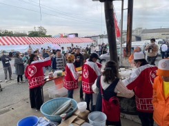 | 11月10日(日)、天皇皇后両陛下をお迎えして、大分市・別府市で開催される「第43回豊かな海づくり大会」のサテライト会場として中津市小祝漁港で行なわれる「お魚市民感謝デー」で竹馬会の大鍋を使って中津市飲食業組合の皆さんがふるまい鍋を実施しました。当日は配布と同時に長蛇の列が出来1,100食のつみれ汁を完食しました。 |